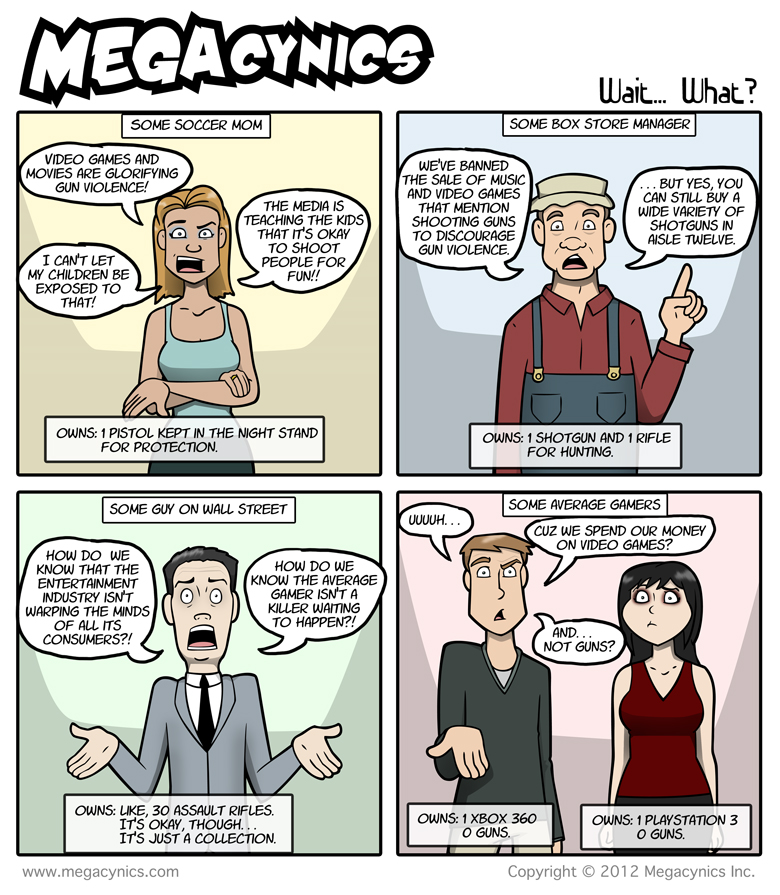 Okay. I just want to say (before any comment backlash) that this is a comic, and not meant as an attack on any responsible gun owners. This idea popped into my head when I was reading through comments people had posted on the internet after certain tragic events. I'm not trying to make light of any situation, I am simply speaking my mind in response to hearing gun owners/organizations blame the entertainment industry for gun violence instead of the people that commit the crimes. I WILL absolutely lock out comments if this turns into any kind of hateful debate over peoples own personal beliefs. Take this comic for what it is. A joke.