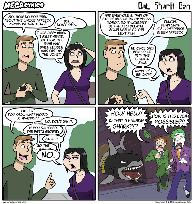 This comic... Well there's no other way to explain it really, it was a train of thought that ran through my brain really late at night and I just couldn't forget the vision of the Villains being chased by a great white dressed like Batman. This is what you get, internet, I have no other explanation.